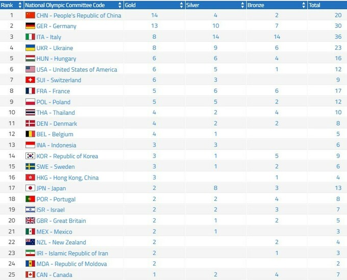 В топ-3 входят: Китай (14–4–2), Германия (13–10–7) и Италия (8–14–14).