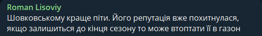 Roman Lisoviy: Шовковскому лучше уйти. Его репутация пошатнулась, если останется до конца сезона, то может втоптать ее в газон.