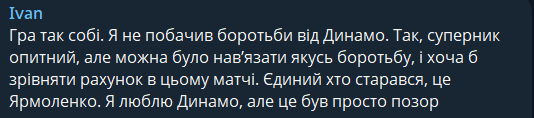 Ivan: Игра так себе. Я не увидел борьбу от Динамо. Да, соперник опытный, но можно было навязать какую-нибудь борьбу, и хотя бы сравнять счет в этом матче. Единственный кто старался, это Ярмоленко. Я люблю Динамо, но это был просто позор.