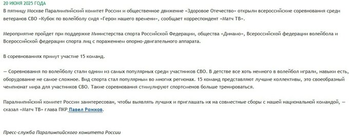 Отметим, что 22 июня в Москве Паралимпийский комитет рф совместно со всероссийской федерацией волейбола провел пропагандистское мероприятие – всероссийские соревнования среди российских оккупантов «Кубок по волейболу сидя «Герои нашего времени». Кубок выиграла сборная Бурятии, второе место заняла сборная Москвы, а бронзовые медали завоевала команда Забайкальского края.