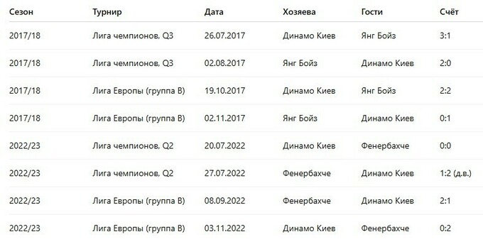 Кроме того, в сезоне 2022/23 Динамо дважды сыграло против турецкого Фенербахче. Сначала была зафиксирована победа по сумме двух матчей в Q2 ЛЧ (0:0, 2:1 д.в.), а затем последовали неудачные поединки в групповом раунде Лиги Европы (0:2, 1:2).
