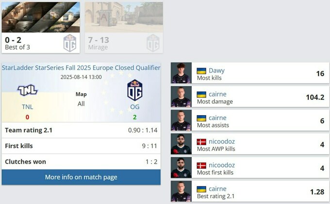 Команда OG обыграла TNL со счетом 2:0 в матче закрытой квалификации StarLadder StarSeries Fall 2025 для Европы. Первая карта Mirage завершилась со счетом 13:7 в пользу OG, а на второй – Nuke – украинский коллектив оказал сопротивление, но уступил 10:13.