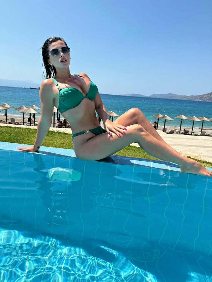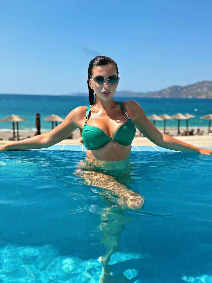 Супруга полузащитника польского «Ракува» Владислава Кочергина предстала в зеленом бикини у бассейна с видом на Эгейское море.