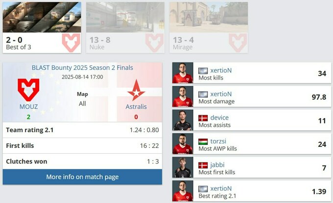 MOUZ обеспечили себе место в полуфинале LAN-финала BLAST Bounty Season 2, одержав быструю победу над Astralis со счетом 2:0 (Nuke 13:8, Mirage 13:4). Датчане смогли набрать большинство своих раундов только тогда, когда соперник был с неполным вооружением, а в перестрелках и тактической игре MOUZ были на голову сильнее.