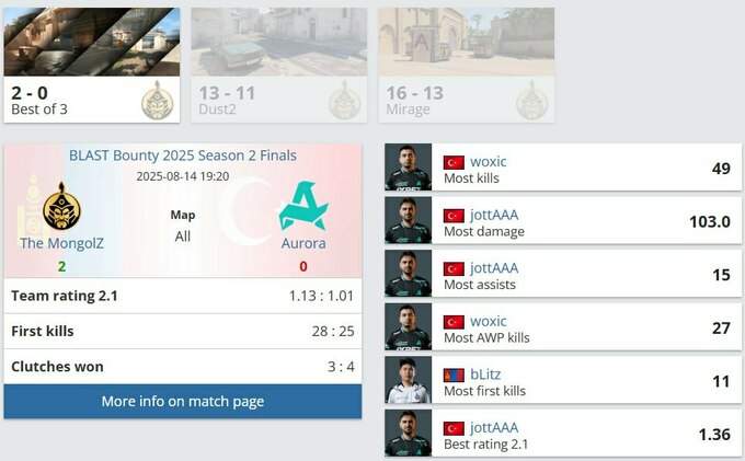 The MongolZ также вышли в полуфинал, обыграв Aurora 2:0 после невероятного камбэка на Mirage. На Dust2, выбранном Aurora, монгольская команда победила 13:11, а на Mirage, начав атаку с 0:11, смогла отыграться и выиграть в овертайме.