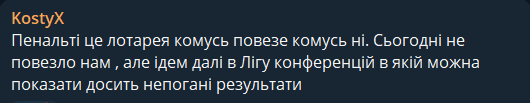 KostyX: Пенальти это лотерея, кому повезет, кому нет. Сегодня не повезло нам, но идем дальше в Лигу конференций, в которой можно показать довольно неплохие результаты.