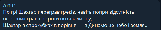 Artur: По игре Шахтер переиграл греков, даже при отсутствии основных игроков кроты показали игру. Шахтер в еврокубках по сравнению с Динамо это небо и земля.