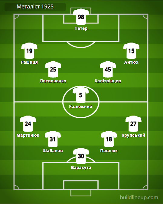 «Металлист 1925»: Варакута – Мартынюк, Шабанов, Павлюк, Крупский – Литвиненко (Чурко, 89), Калюжный, Калитвинцев (Панченко, 80) – Рашица (Когут, 80), Петер (Мба, 60), Антюх (Гаджиев, 89).