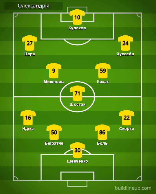 «Александрия»: Н. Шевченко – Ндика, Беиратче, Боль, Скорко – Мишнев, Шостак (Фернандо, 66), Козак (Булеца, 66) – Цара (Жота, 71), Кулаков (Амарал, 78), Хуссейн (Жонатан, 66).