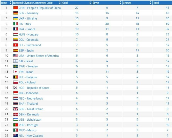 В топ-5 медального зачета входят: Китай (27–9–7), Германия (15–14–14), Украина (15–9–11), Италия (12–20–18) и Франция (10–11–13).