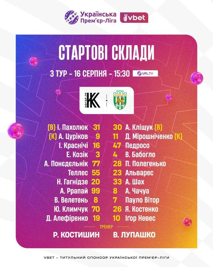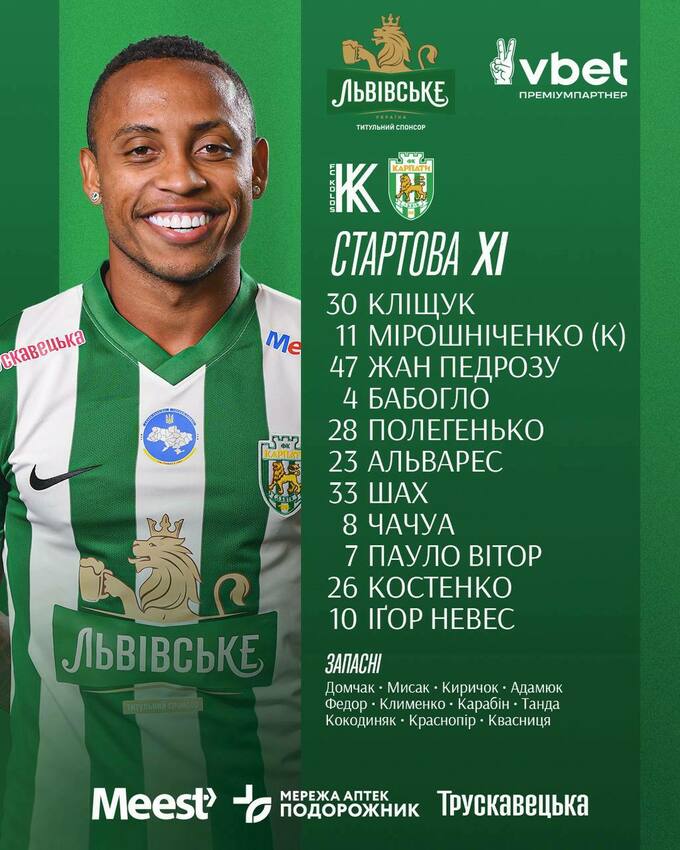 Карпаты: Клищук, Мирошниченко, Жан Педрозу, Бабогло, Плегенько, АЛьварес. Шах, Чачуа, Пауло Витор, Костенко, Игор Невес