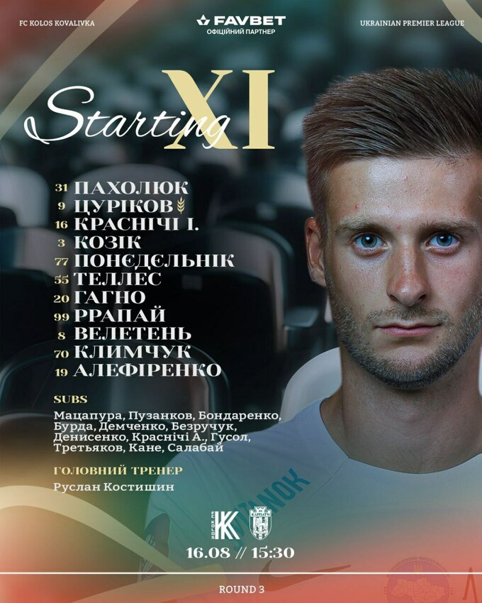 Колос: Пахолюк, Цуриков, Красничи, Пояк, Понедельник, Теллес, Ррапай, Гагно, Велетень, Клиук, Алефриенко