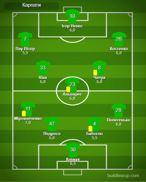 «Карпаты»: Кліщук – Мирошниченко, Педросо, Бабогло, Полегенько – Шах (Клименко, 56), Альварес, Чачуа (Краснопир, 56) – Витор (Карабин, 46), Костенко (Квасница, 80), Игор Невес