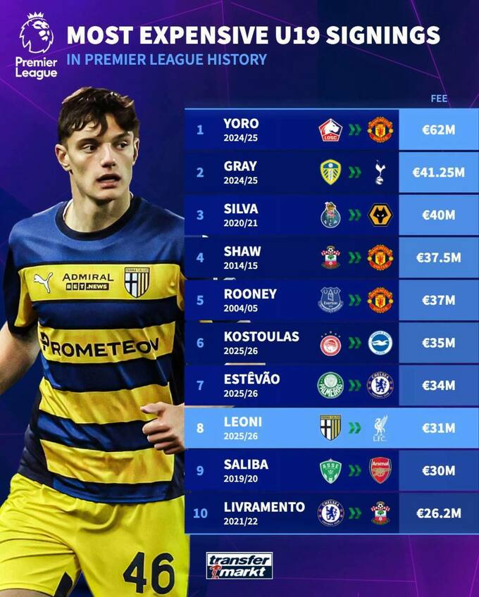 Первое место в рейтинге самых дорогих трансферов Премьер-лиги занимает французский защитник «Манчестер Юнайтед» Лени Йоро, который в сезоне 2024/25 перешел из «Лилля» в состав «красных дьяволов» за 62 млн.