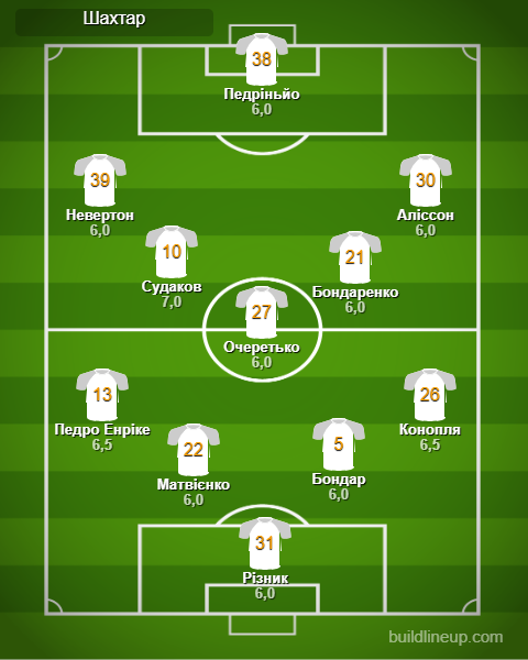 «Шахтёр»: Ризнык – Педро Энрике (Азаров, 90+2), Матвиенко, Бондарь, Конопля (Винисиус, 60) – Очеретько – Невертон, Судаков, Бондаренко (Марлон Гомес, 90+2), Алиссон (Кауа Элиас, 34) – Педриньо (Феррейра, 90+2)