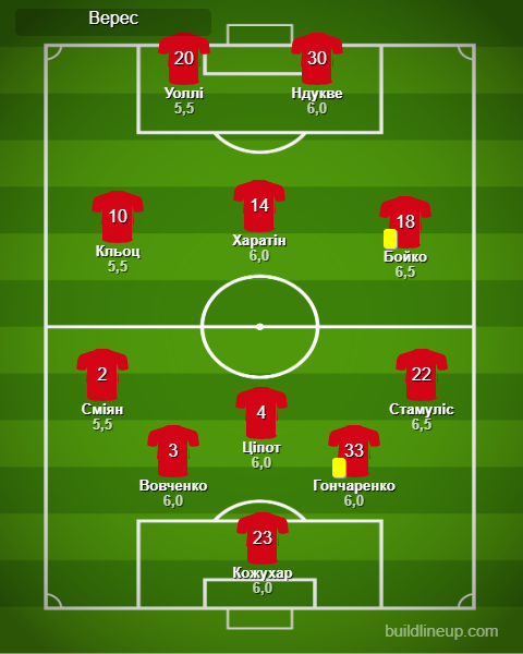 «Верес»: Кожухарь – Смиян, Вовченко, Ципот, Гончаренко, Стамулис – Бойко (Кучеров, 72), Харатин (Годя, 85), Клёц (Куция, 46) – Уолли (Стень, 46), Ндукве (Шарай, 72)