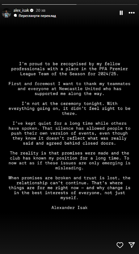 «Я горжусь тем, что мои коллеги-профессионалы признали мое место в команде сезона Премьер-лиги PFA 2024/25». Прежде всего, я хочу поблагодарить своих товарищей по команде и всех в «Ньюкасле», кто поддерживал меня на этом пути. Сегодня меня нет на церемонии. Учитывая все, что происходило, было неправильно там быть.