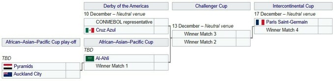 Первый раунд пройдет между победителями Лиги чемпионов Африки и Океании. Победитель сыграет во втором раунде с чемпионом Азии. Параллельно победители Кубка Либертадорес и Кубка чемпионов КОНКАКАФ встретятся в дерби Америки. Далее победители матчей разыграют Challenger Cup, а лучший клуб из этого поединка встретится в финале турнира с ПСЖ, победителем Лиги чемпионов УЕФА 2024/25.