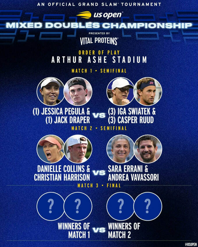 По итогам игрового дня были определены полуфинальные пары. Борьбу за трофей мейджора продолжают тандемы: Джессика Пегула / Джек Дрейпер, Ига Свентек / Каспер Рууд, Даниэль Коллинз / Кристиан Харрисон, Сара Эррани / Андреа Вавассори.