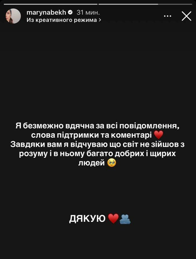 «Я очень благодарна за все сообщения, слова поддержки и комментарии. Благодаря вам я чувствую, что мир не сошел с ума и в нем много добрых и искренних людей. Спасибо», – написала Марина.