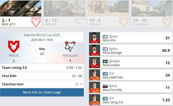 MOUZ выбили Virtus.pro с Esports World Cup 2025, хотя серия началась неудачно для европейского коллектива. Российская команда выиграла свой пик Inferno, однако дальше инициативу полностью перехватили «мышки».