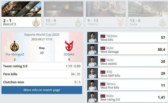 The MongolZ обеспечили себе место в полуфинале Esports World Cup 2025, обыграв 3DMAX со счетом 2:1.