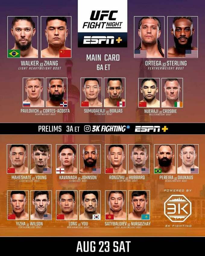Главным событием шоу станет нетитульный 5-раундовый бой в полутяжелом весе (до 93 кг) – в октагоне встретятся китайский нокаутер Чжан Миньян (19–6) и бразилец Джонни Уокер (21–9).