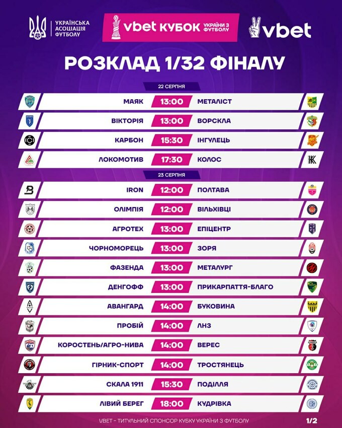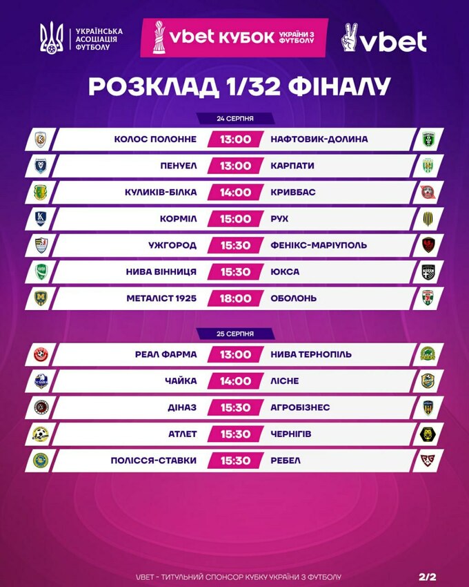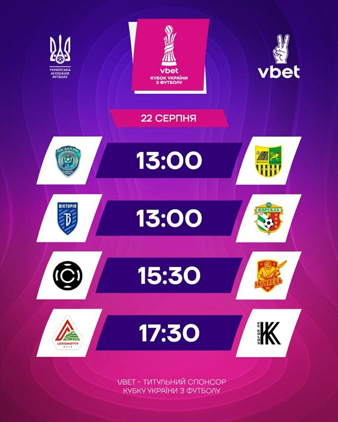 22 августа пройдут первые четыре матча 1/32 финала Кубка Украины 2025/26.