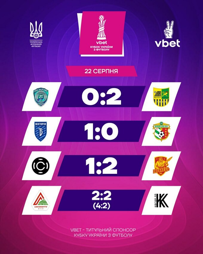22 августа состоялись первые четыре матча 1/32 финала Кубка Украины 2025/26.