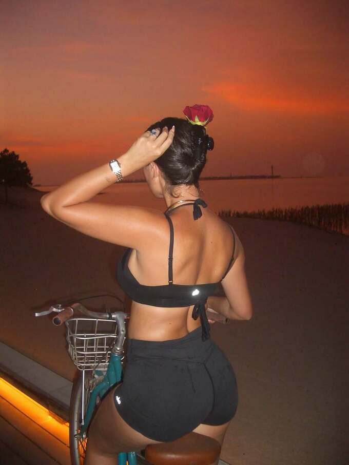 Короткие шорты и облегающий топ выгодно подчеркивают ее фигуру и стройные ноги.