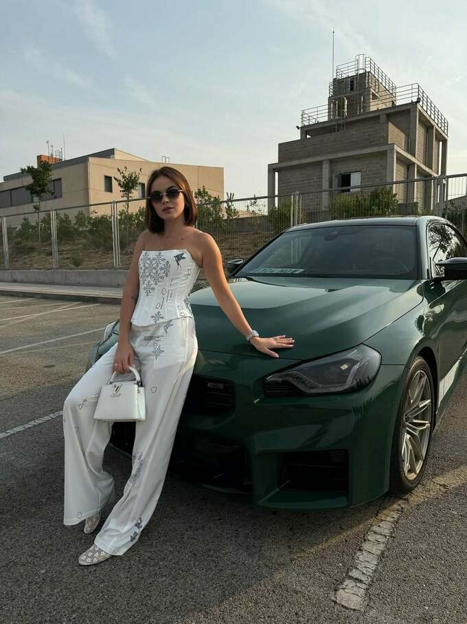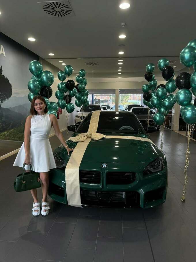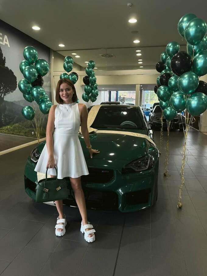 На кадрах она позирует в елегантном белом платье рядом с зеленым BMW M2, украшенным лентой и шарами. Как рассказала сама Анастасия, машину ей подарил Андрей в честь годовщины их отношений.