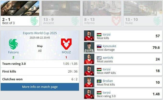 На Inferno это обернулось поражением, но на Nuke Falcons удержали победу благодаря солидному отрыву в первой половине и ключевому клатчу 1v2 в исполнении Ильи «m0NESY» Осипова, который прорвался сквозь огонь Адама «torzsi» Торжаша. Хотя MOUZ смогли догнать соперника до двузначных показателей, Falcons поставили точку в серии благодаря победному форс-баю.