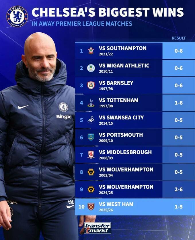 Победа «Челси» над «Вест Хэмом» стала 10-й крупнейшей выездной победой в АПЛ в истории клуба.