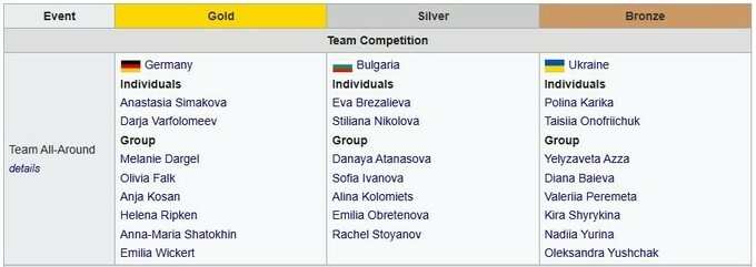 Германия и Болгария, которые выступали во второй части групповых упражнений, сумели обойти Украину в итоговом зачете, однако украинкам удалось удержать бронзовую позицию.