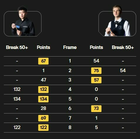 Китаец порадовал местную публику тремя сенчури-брейками (132, 134, 122). В 5-м фрейме Чжао был близок к максимальному брейку, но не забил простой предпоследний шар (розовый) и остановился на 134 очках.
