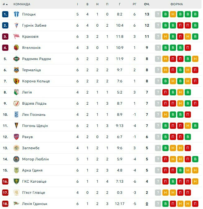 Из-за штрафа в 5 очков за финансовые нарушения Лехия занимает последнее 18-е место, имея 0 очков после 6 туров.