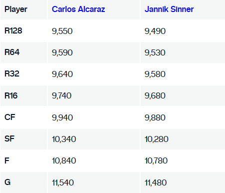 Потенциальные очки Алькараса и Синнера в зависимости от их выступлений на US Open 2025