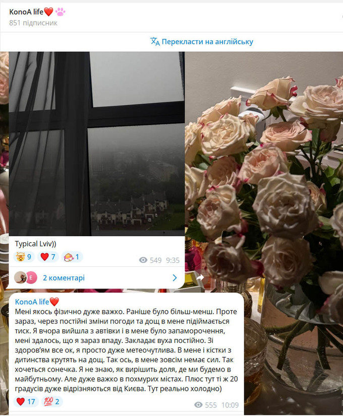 «У меня постоянное головокружение, закладывает уши, очень хочется солнца», — призналась жена футболиста.