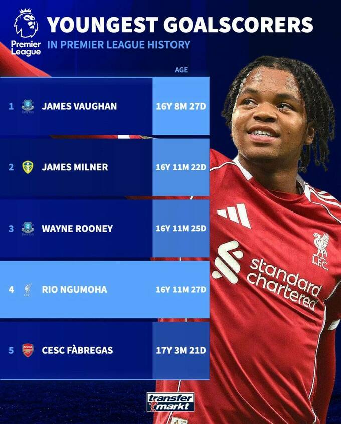 Во-вторых, Рио стал четвертым самым молодым бомбардиром в истории Премьер-лиги. Выше него расположились только: Уэйн Руни («Эвертон», 16 лет, 11 месяцев, 25 дней), Джеймс Милнер («Лидс», 16 лет 11 месяцев 22 дня) и Джеймс Воган («Эвертон», 16 лет 8 месяцев, 27 дней).