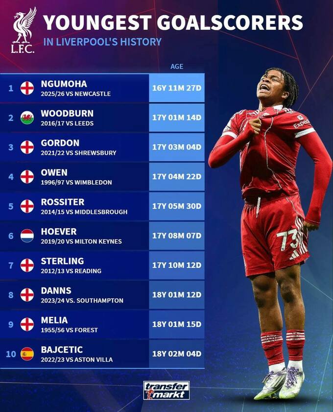 Во-первых, 16-летний нападающий стал самым молодым голеадором в истории «мерсисайдцев» (16 лет, 11 месяцев, 27 дней). Предыдущий рекорд принадлежал Бену Вудберну, который в сезоне 2016/17 забил в ворота «Лидса» (17 лет, 1 месяц, 14 дней).