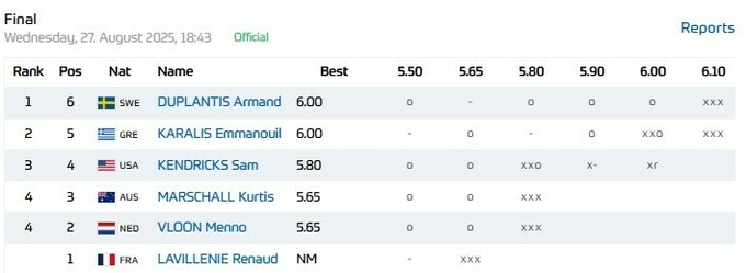 - 1. Арман Дюплантис (Швеция) – 6.00 м