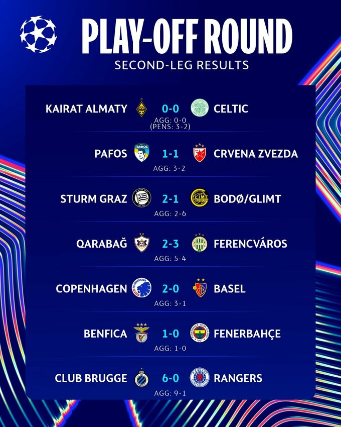 Успех празднует Карабах из Азербайджана, который по сумме двух матчей вышел в основной этап, несмотря на поражение от Ференцвароша (2:3 после победы 3:1). Карабах во второй раз выступит в основе ЛЧ (впервые играл в сезоне 2017/18).