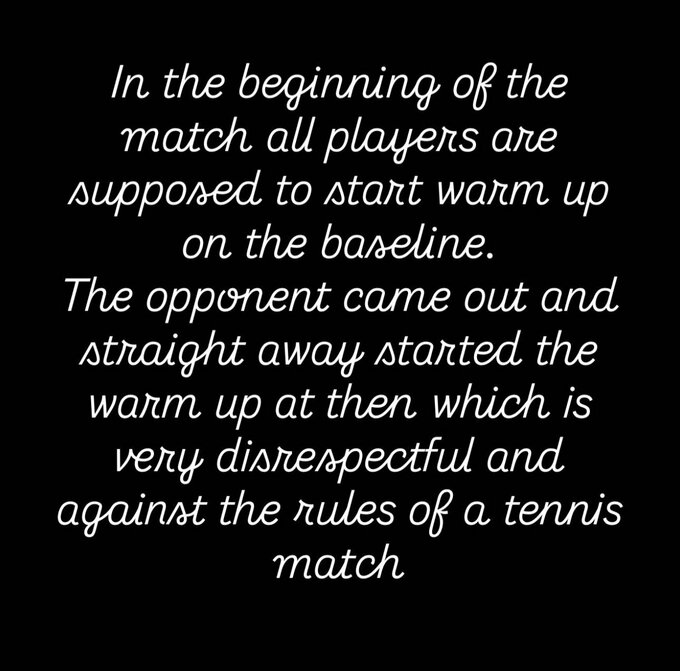 В теннисе есть правила, которым следуют большинство игроков. Со мной подобное случилось впервые в туре. Если она играет у себя на родине, это не значит, что она может так вести себя и делать всё, что захочет. Перед матчем все игроки должны начинать разминку на задней линии. Она вышла к сетке и сразу же начала разминку, что очень неуважительно и противоречит правилам теннисного матча. Спасибо всем моим болельщикам за поддержку. Я вернусь ещё сильнее. Такие ситуации мотивируют меня работать усерднее.