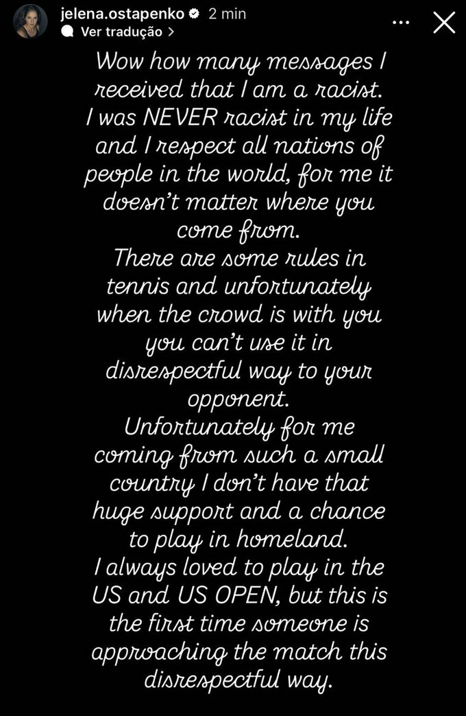 Получила сколько сообщений о том, что я расистка. Я никогда в жизни не была расисткой и уважаю все нации и народы мира, происхождение для меня не имеет значения. В теннисе есть определенные правила. Когда трибуны за тебя, ты не можешь использовать публику в неуважительных целях против соперницы. К сожалению, у меня, приехавшей из маленькой страны, нет такой огромной поддержки и возможности играть дома.