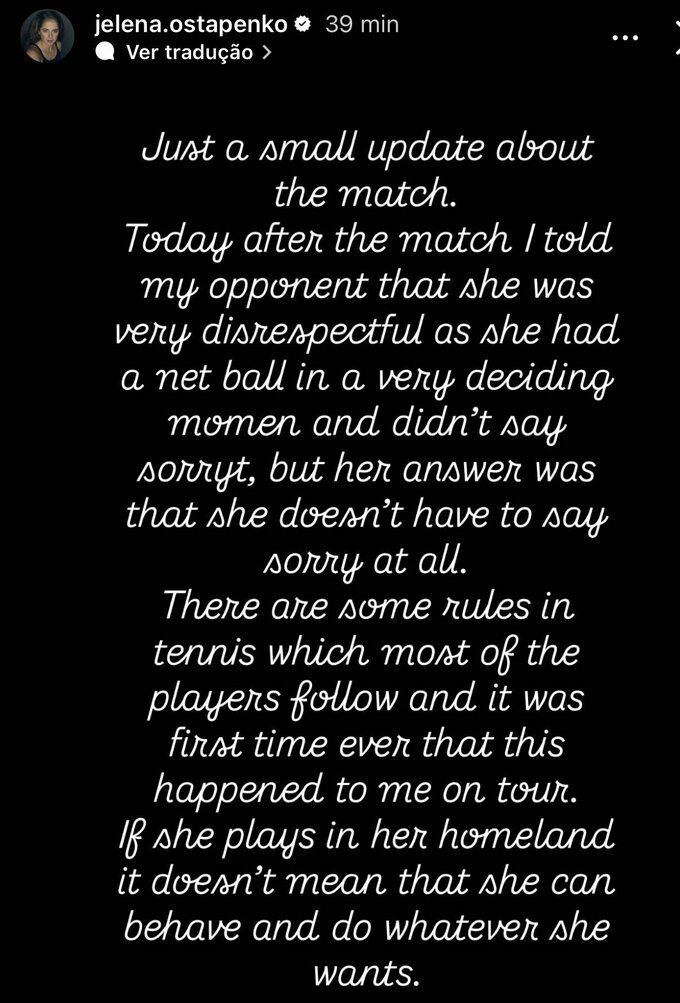 Просто розпсихувалася після матчу через те, що її обіграли. А те що там типу не вибачилася за відскок від сітки чи не так розминалася - це все уже потім добавила як причину і оправдання своїй поведінці після матчу. Такий вибух емоцій не оправдується якимось одним епізодом з відскоком від сітки. Ну, не вибачилася - та й ладно, проїхали, буває всяке, такого правила немає і не завжди вибачаються, це не привід і не оправдання починати істерику після матчу зі звинуваченнями в усіх гріхах коли у самої все рило в пуху.