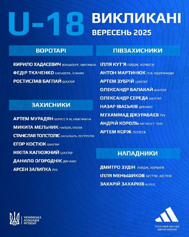Защитники: Егор Костюк, Никита Калюжный (оба – «Шахтер» Донецк), Даниил Огородник («Динамо» Киев), Арсен Залипка («Рух» Львов), Артем Мурадян («Боруссия» М, Германия), Никита Мельник («Наполи», Италия), Станислав Толстолис («Насьональ», Португалия)