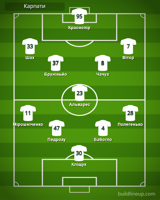 «Карпаты»: Клищук – Мирошниченко (Фаби, 69), Педрозу, Бабогло, Полегенько – Бруниньо, Альварес (Федор, 81), Чачуа – Шах (Клименко, 69), Краснопир (Игор, 69), Витор (Адамюк, 33).