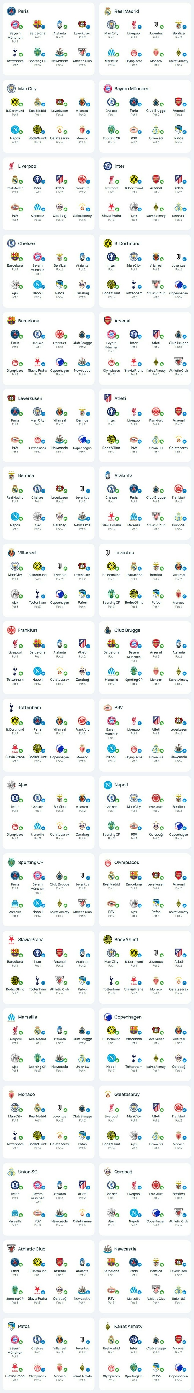 - Манчестер Сити: Боруссия Д, Реал, Байер, Вильярреал, Наполи, Буде-Глимт, Галатасарай, Монако