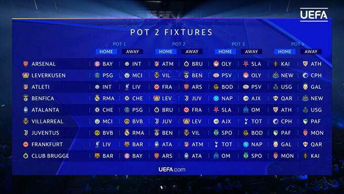 - Арсенал: Бавария, Интер, Атлетико М, Брюгге, Олимпиакос, Славия, Кайрат, Атлетик Б