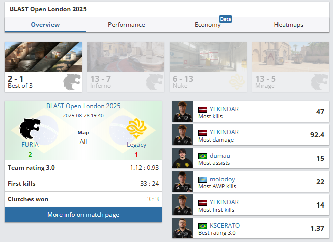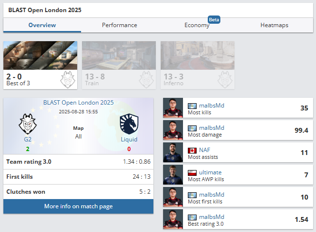 Во второй игровой день BLAST Open London преимущество фаворитов подтвердилось: все четыре матча группы B завершились победами более рейтинговых команд. Дальше в верхнюю сетку прошли MOUZ, G2, Spirit и FURIA, тогда как Imperial, Liquid, FlyQuest и Legacy оказались в шаге от вылета и вынуждены бороться в нижней сетке.